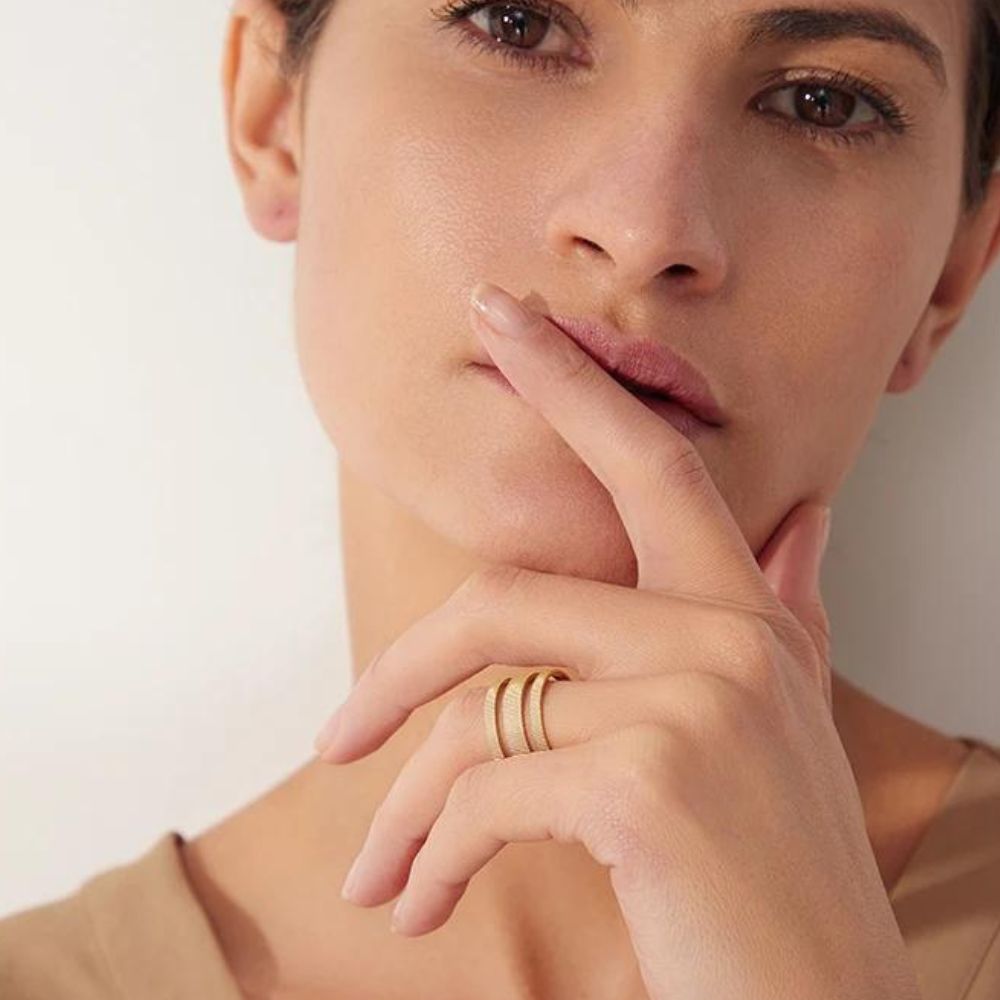 Um Anel Triplo Ajustável Banhado a Ouro 18K é uma joia versátil e elegante. Composto por três anéis interligados, o design cria um visual moderno e sofisticado. A característica ajustável permite adaptar o anel ao tamanho desejado. Feito com uma base de metal banhada em ouro 18 quilates, ele oferece um brilho luxuoso. Este anel triplo é uma escolha contemporânea e estilosa, ideal para diversas ocasiões. Hipoalergênico livre de níquel e chumbo.