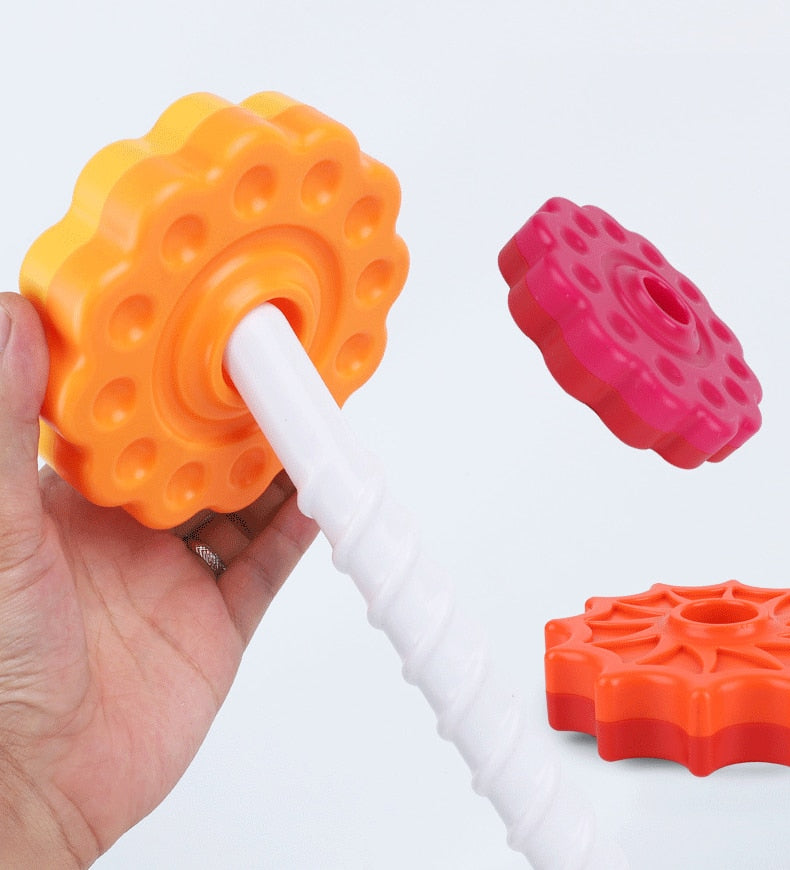 Esse brinquedo educativo é composto por diferentes peças giratórias, que permitem à criança explorar movimentos, encaixes e combinações. Elas podem experimentar diferentes formas de encaixe, empilhando as peças e observando as diferentes combinações que podem ser criadas.