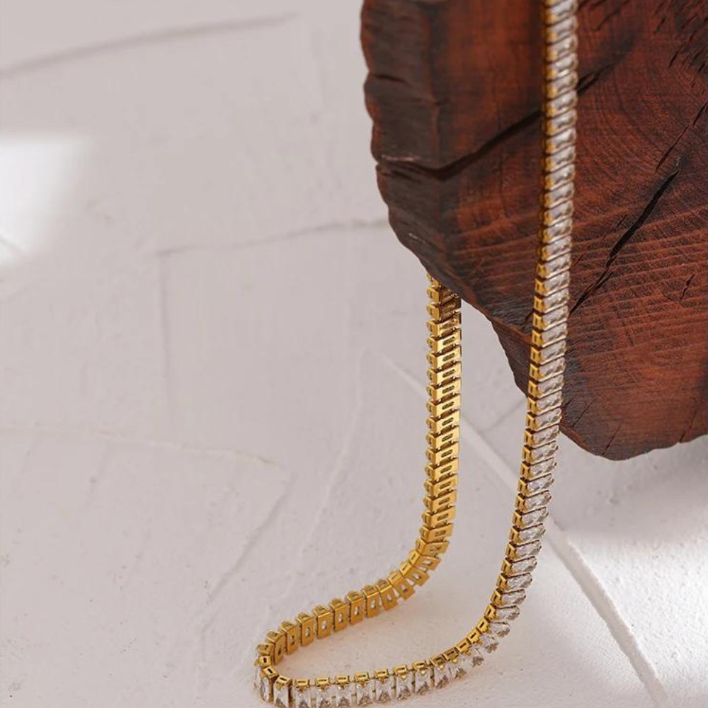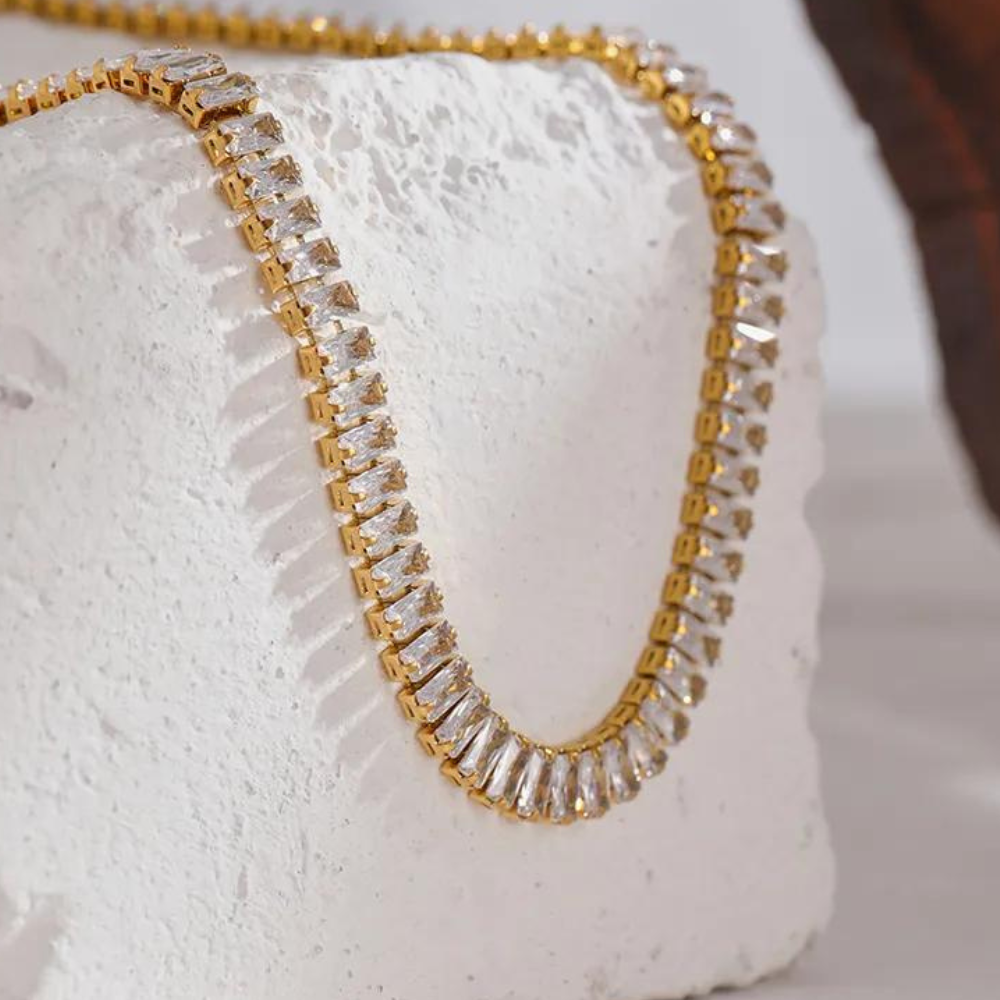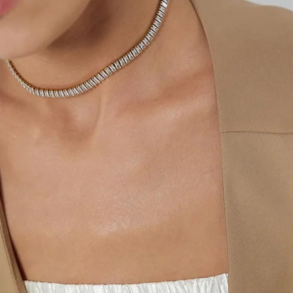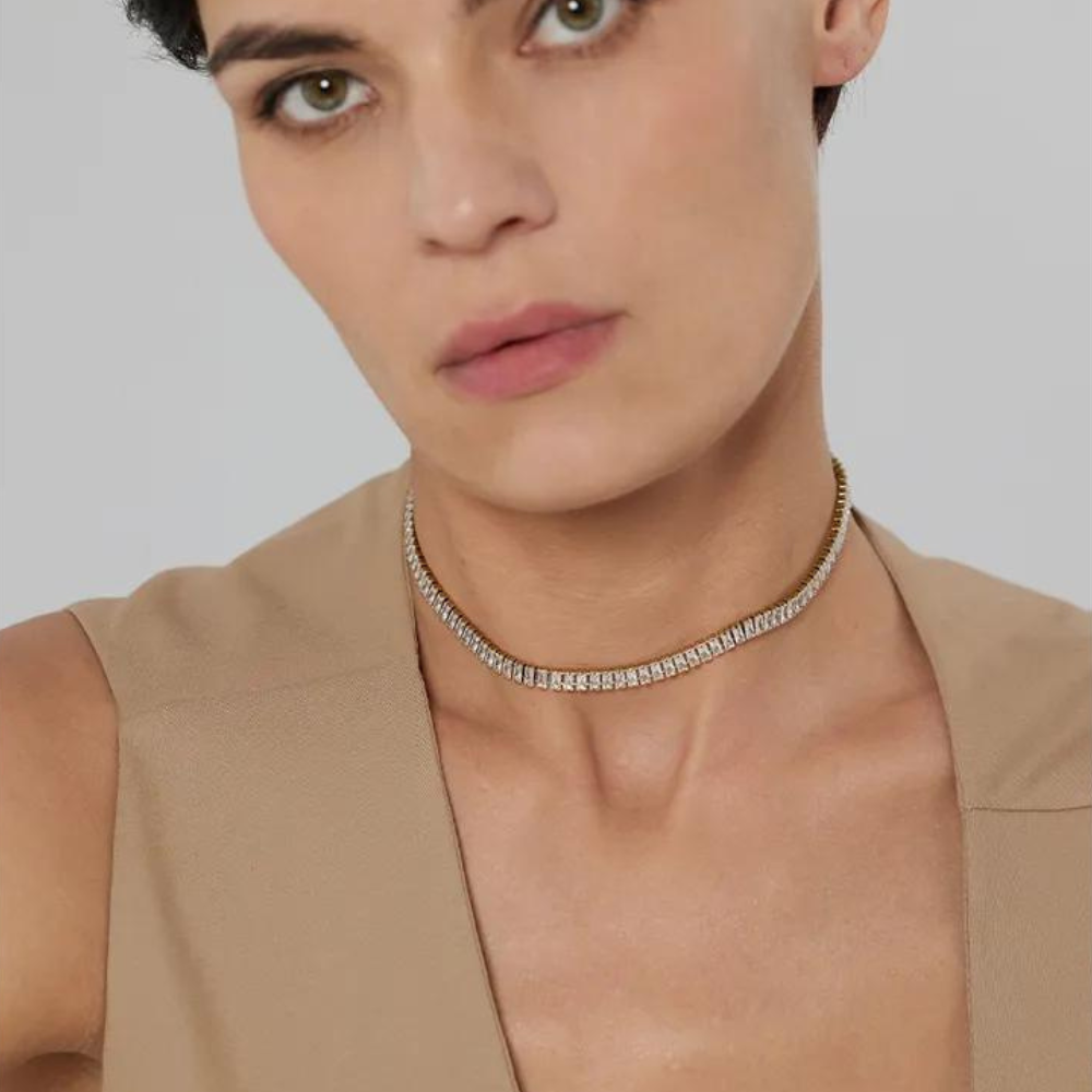 O Colar Gargantilha Riviera é uma peça deslumbrante e luxuosa. Com pedras preciosas cravejadas ao redor da garganta, este colar transmite elegância e sofisticação.