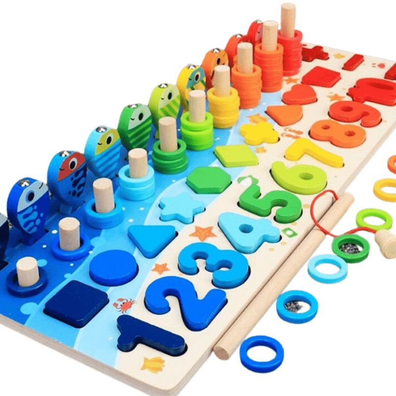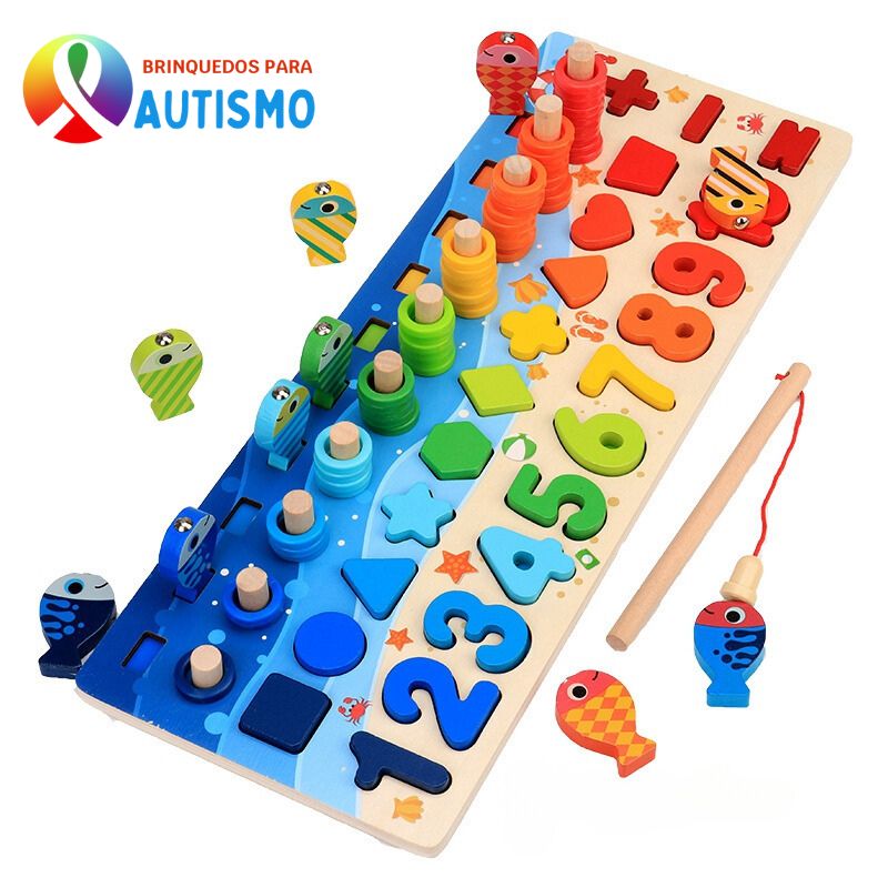1x Quebra Cabeça de Madeira Educacional Montessori completo, com uma base de madeira resistente e durável, 10 formas geométricas coloridas para encaixar, 55 anéis para empilhar, 10 peixes para pescar e uma vara de pesca magnética.