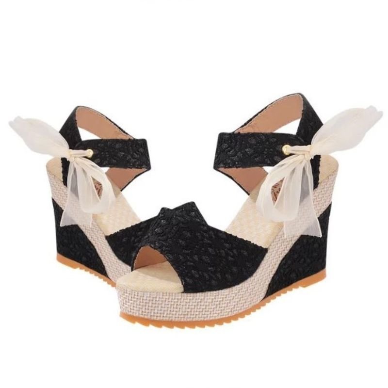 Apresentamos uma sandália plataforma encantadora e sofisticada, adornada com detalhes de renda e um delicado laço lateral. Este calçado une o charme da renda com a elegância de um design de plataforma, resultando em um visual único e cativante.